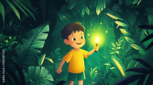 charming illustration of a young boy exploring a lush forest, holding a torch, whimsical and adventurous, perfect for educational and storytelling themes, vibrant greens