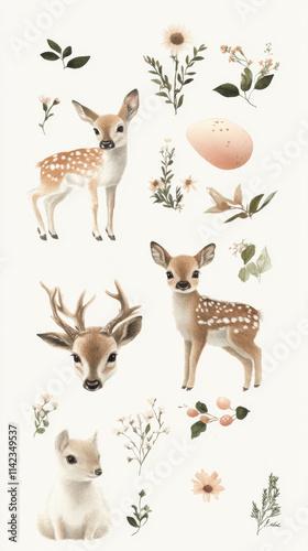 Charming illustrations of deer, flowers, and an egg in a whimsical design