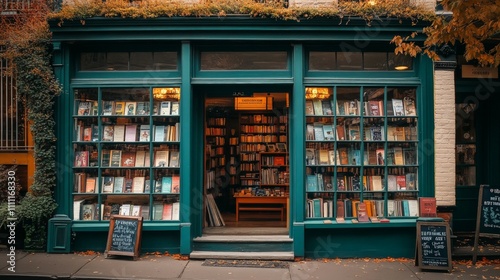 Charming Independent Bookstore, large glass windows showcase vibrant book covers, inviting atmosphere with cozy reading nooks and shelves brimming with books, perfect for book lovers.
