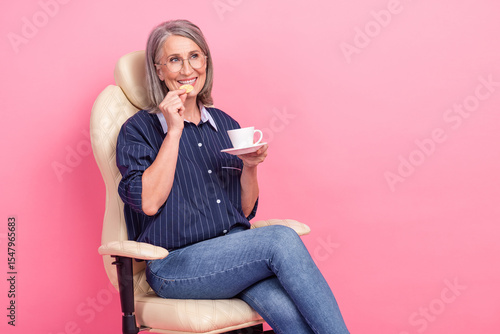 Charming mature woman enjoying tea in a casual outfit on a pink background promoting lifestyle and happiness