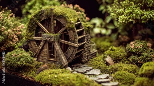 Charming Miniature Water Wheel Surrounded by Lush Greenery