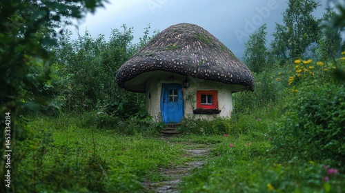 Charming mushroom-shaped house surrounded by lush greenery and a winding path.