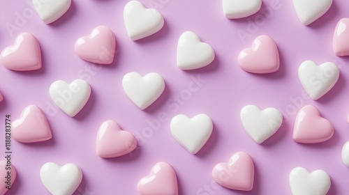 Charming pink and white heart pattern on a soft lavender backdrop, playful design for textiles and decor, whimsical and romantic appeal