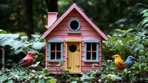 Charming Pink Birdhouse in a Lush Garden: A Perfect Avian Haven