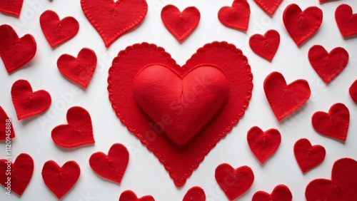 Charming Red Felt Hearts Pattern, Large Central Heart with Smaller Surrounding Hearts on White Background