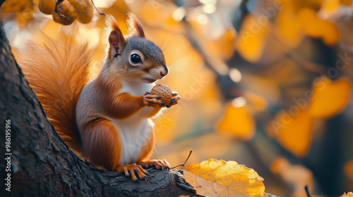 Charming Red Squirrel Holding Nut with Autumn Leaves and Soft Bokeh Background in Warm Light