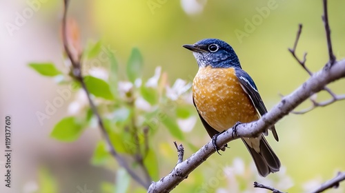 Charming Robin Perched on Branch Against Soft Blurred Floral Background : Generative AI