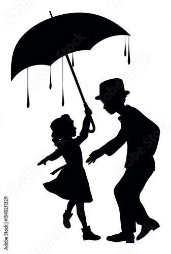Charming Silhouette of Child and Adult Under Umbrella in Rainy Scene