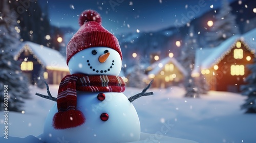 Charming snowy village scene with houses covered in twinkling lights and snowmen standing tall. Ai generative