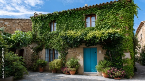 Charming stone house covered in greenery with blue door located in a serene village setting during daylight hours