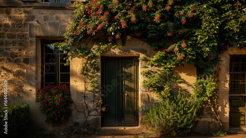 Charming stone wall adorned with vibrant red flowers and lush greenery surrounds rustic door. warm sunlight casts gentle shadows, creating serene and inviting atmosphere