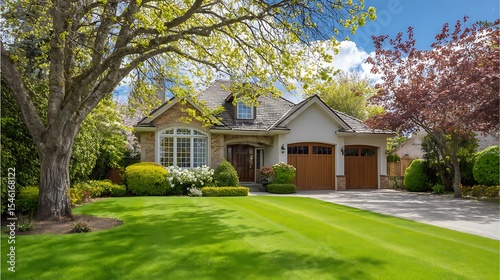 Charming suburban house with a double garage vibrant green lawn stretching to the curb warm natural light adding a cozy feel. .