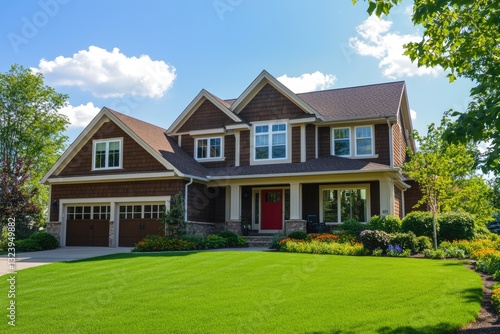 Charming two-story home on a lush lawn, featuring a red front door, and nicely landscaped surroundings
