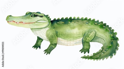Charming Watercolor Crocodile Clipart, delightful design with soft features, ideal for baby shower themes, isolated on white background, ample space for personalized text.