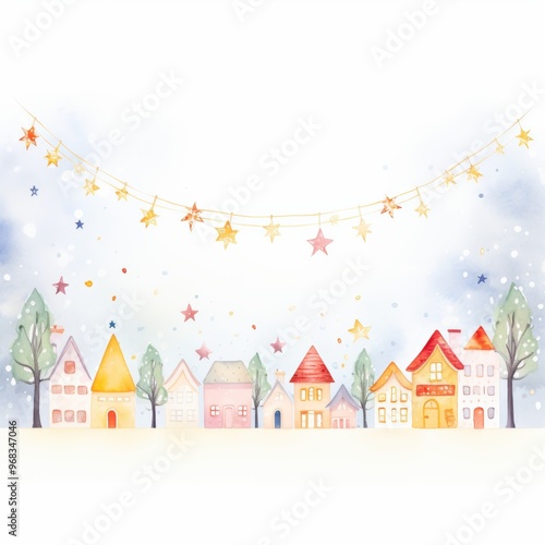 Charming watercolor illustration of colorful houses with trees and stars, perfect for festive or cozy home decor themes.