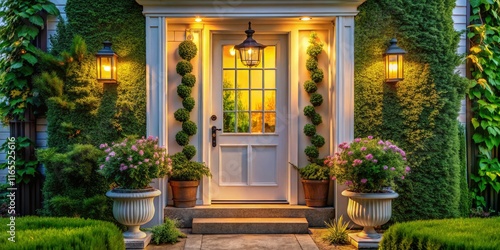 Charming White Door with Glass Panels & Lantern - Panoramic Evening Garden