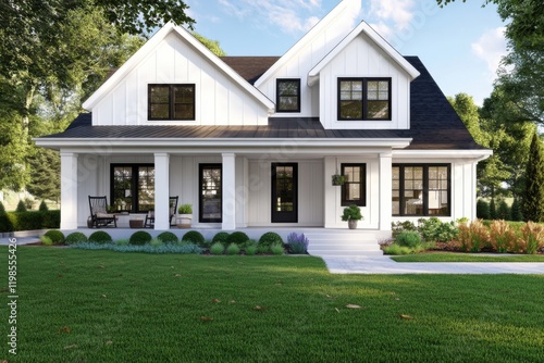 Charming white farmhouse with modern touches situated in a scenic neighborhood surrounded by lush greenery and beautiful landscaping