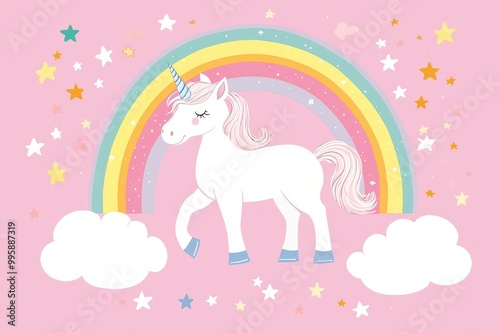 Charming white unicorn surrounded by a rainbow clouds and stars perfect for children s designs including prints posters cards and stickers in a 2D cartoon style