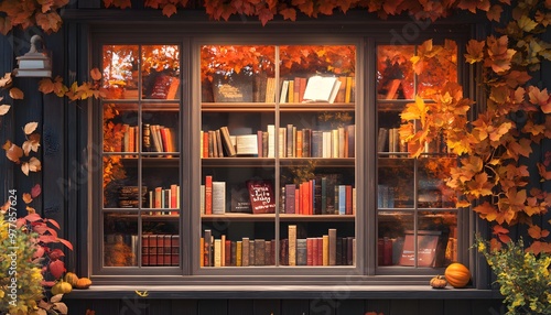 Charming window display with a bookshelf adorned by autumn leaves, inviting warmth and cozy reading moments.