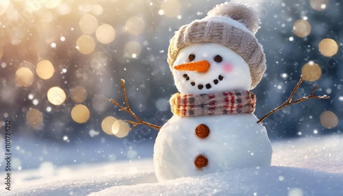 Charming Winter Holiday Christmas Background Banner Featuring a Cute and Funny Laughing Snowman Wearing a Cozy Woolen Hat and Scarf in a Magical Snowy Scene Full of Festive Cheer and Warmth
