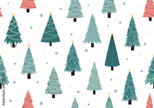 Charming winter holiday christmas trees decorated with festive lights and ornaments