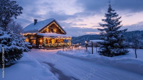 Charming winter house with festive decorations, snow-covered roof, evening scene