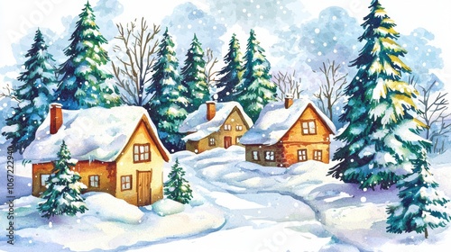 Charming winter scene featuring cozy cottages surrounded by snow-covered trees, evoking a warm and festive atmosphere.