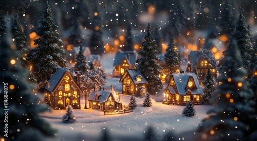 Charming winter village adorned with sparkling lights in a snowy landscape during a serene night in a forest