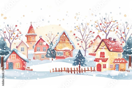 Charming winter village illustration with cozy houses, snow-covered trees, and a peaceful atmosphere. Perfect for holiday greeting cards.
