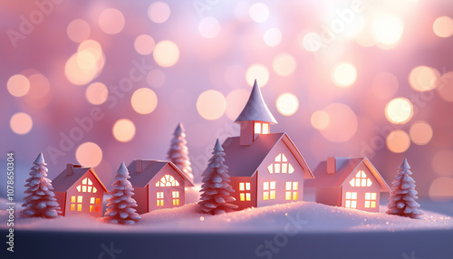 Charming winter village scene with snow-covered houses and trees, glowing lights, and festive bokeh background