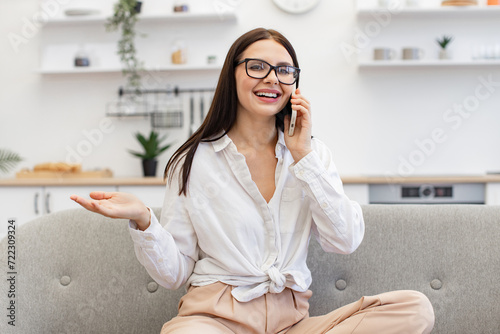 Charming woman in casual attire enjoying communication with colleagues while sitting on cozy sofa. Positive caucasian female gesturing while having conversation on modern smartphone, staying at home.