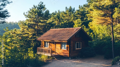 Charming wooden cabin nestled in a lush forest, perfect for a serene getaway surrounded by nature.