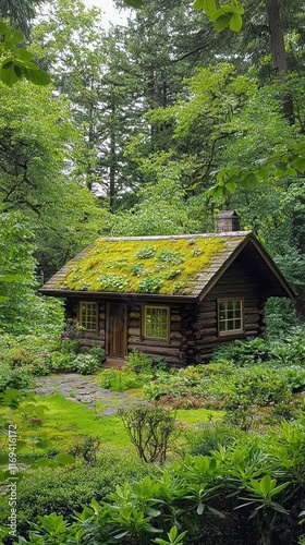 Charming Wooden Cabin Surrounded by Lush Green Forest Landscape