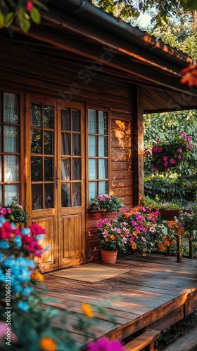 Charming wooden house entrance surrounded by vibrant flowers and greenery, creating a serene and inviting atmosphere.