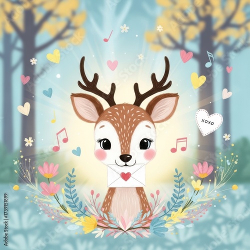 Charming Woodland Deer with Love Letter in a Heart Filled Scene