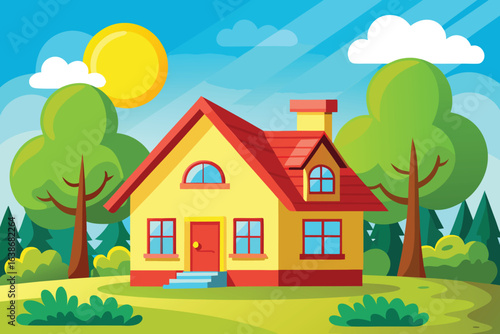 Charming yellow house with a red roof nestled in a vibrant green landscape under a sunny sky, perfect for real estate marketing, children's books, or illustrating the joy of homeownership