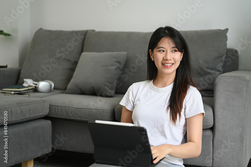 Charming young Asian woman sitting in living room with digital tablet and looking away