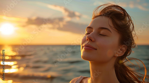 Charming young woman standing by the sea with closed eyes, expressing delight, enjoying the last rays of sunset