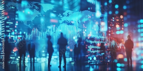 Charting Success: Harnessing Market Insights. A stock market graph and business people in motion on a double exposure background, with a blurred world map