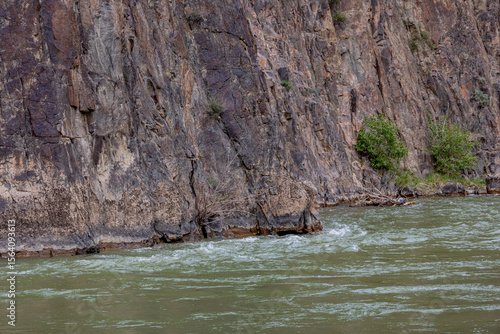 Charyn River in Kazakhstan flows swiftly alongside steep rocky cliffs and sparse green bushes