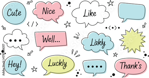 Chat Bubbles Set with HandDrawn Style Design Words in Various Shapes, Colors, and Icons