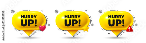 Chat speech bubble 3d icons. Hurry up sale tag. Special offer sign. Advertising discounts symbol. Hurry up sale chat offer. Speech bubble banners. Text box balloon. Vector