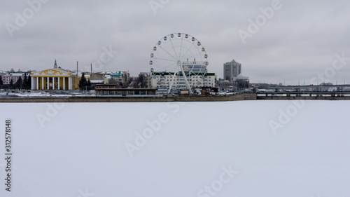 Cheboksary. Ferris wheel and the building of the drama theater on the shore of the Cheboksary Bay