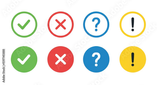 Check mark, cross mark, question mark, and exclamation mark icons set on white background