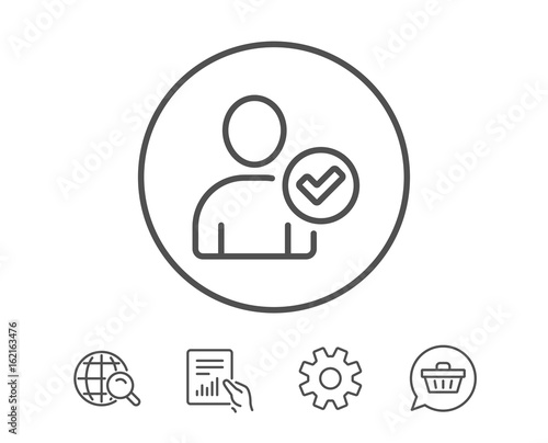 Checked User line icon. Profile Avatar with Tick sign. Person silhouette symbol. Hold Report, Service and Global search line signs. Shopping cart icon. Editable stroke. Vector