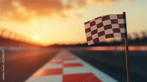 Checkered Flag at Sunset on Racing Track with Soft Focus Background and Warm Golden Sky