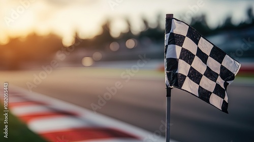 Checkered flag in focus with blurred racetrack in the background, representing the thrill of racing.
