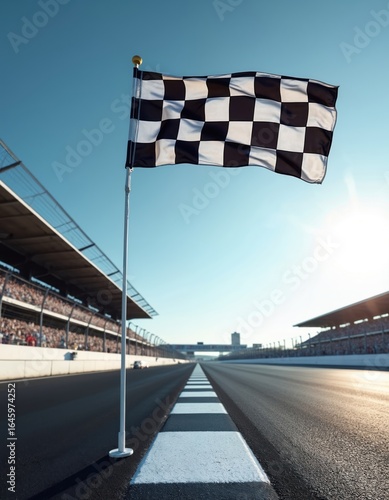 Checkered flag waves at racetrack finish line under clear blue sky. Asphalt track with white markings, grandstands full of spectators. Dynamic low angle perspective captures racing motorsport