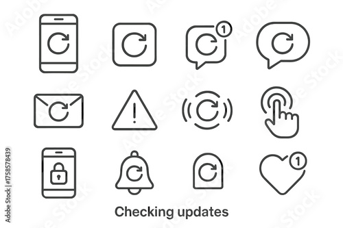 Checking Updates Icons. Checking updates. Line icon set of Checking updates: smartphone, app icon, notification badge, message bubble, chat bubble, email icon,