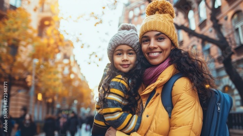 Cheerful african american mother and child in back to school theme photo with blurred background
